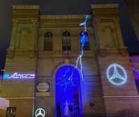 Descripción Producción de contenidos Mapping. Sistema de proyección a base de proyectores 20k y sonido multipunto sobre fachada de 50m.