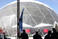 Descripción Montaje de un domo de 12m con estructura lacada en blanco, suelo técnico, túnel de acceso, climatización.